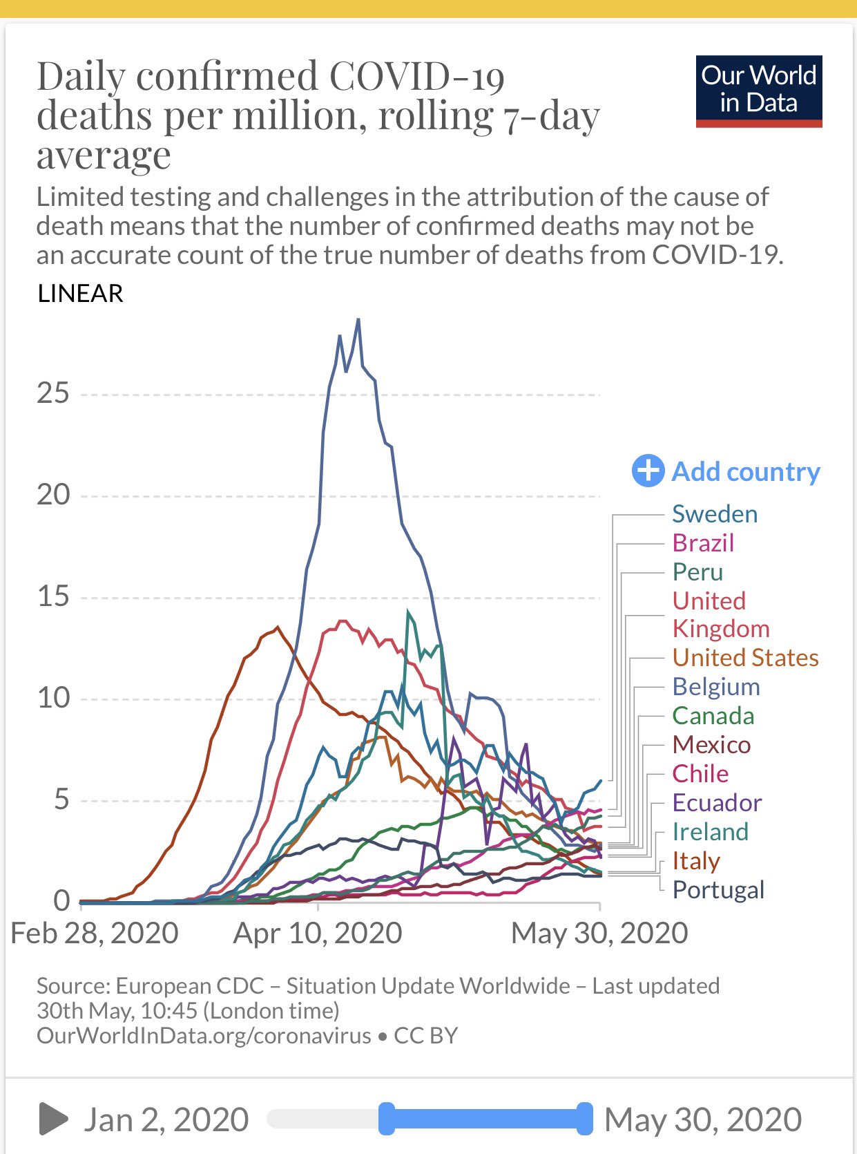 Daily confirmed coronavirus deaths per million, rolling 7-day average. May 30, 2020: